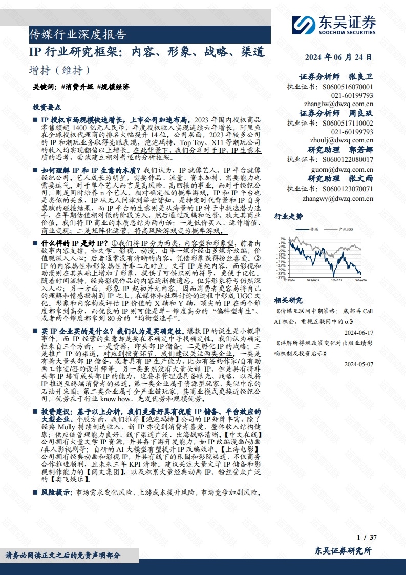 东吴证券传媒行业深度报告SOOCHOW SECURITIESP行业研究框架:内容、形象、战略、渠道2024年06月24日增持(维持)证券分析师张良卫执业证书:S0600516070001021-60199793zhanglw@dwzq.com.cn证券分析师周良玖■P授权市场规模快速增长,上市公司加速布局。2023年国内授权商品执业证书:S0600517110002零售颜超1400亿元人民币,年度授权收入实现连续六年增长,阿里鱼在全球授权代理商的排名大幅提升14位,公司层面,2023年较多公司021-60199793的P和潮玩业务取得亮眼表现,泡泡玛特、Top Toy、X11等潮玩公司zhoulj@dwzq.com.cn的收入均实现翻倍以上增长,在此背景下,我们分享对于P、P生意本研究助理郭若娜质的思考,尝试建立相对普适的分析框架,执业证书:S0600122080017■如何理解P和P生意的本质?我们认为,P就像艺人,IP平台就像guom(@dwzq.com.cn经纪公司,艺人成长为明星,需要作品、流量、资本加持,霄要能力也研究助理张文雨需要运气,对于单个艺人而言是高风险、高回报的事业,而对于经纪公司,则是同时培养n个艺人,相对确定性的概率游戏。P和P平台也执业证书:S0600123070071是类似的关系,P从无人问津到举世皆知,是特定时代背景和P自身zhangwy@dwzq.com.cn禀赋的碰撞结果,而P平台的生意则是从海量的P种子中挑选潜力选手,在早期估值相对低的阶段买入,然后通过改编和运营,放大其商业行业走势价值。我们将P商业的本质总结为两句话:一是低价买入、运作增值、商业变现:二是矩阵化运营,将高风险游戏变为概率游戏,■什么样的P是好P?①我们将P分为两类,内容型和形象型,前者由值观深入人心;后者通常没有清晰的内容,凭借形象获得粉丝喜爱。②P的内容属性和形象属性并非二元对立,文字P是纯内容,而影视和动爱则在其基础上增加了形象,提供了可供识别的符号,更便于记忆,随着时间流转,经典影视作品的内容逐渐被遗忘,但其形象符号仍然深入人心;另一方面,形象P起初并无内容,因而消费者更容易将自己的理解和情感投射到P之上,在媒体和社群讨论的过程中形成UGC文化,形象和内容构成评估P价值的X轴和Y轴,顶尖的P在两个维相关研究度都拿到高分,而优良的P则可能是单一维度高分的“偏科型考生”、《传媒互联网中期策略:底部再Call或者两不维度都拿到80分的“巧衡型选手”AI机会,重视互联网中的a》■买P企业买的是什么?我们认为是买确定性,爆款P的诞生是小概率2024-06-17事件,而P经营的生意却是要在不确定中寻找确定性,我们认为确定性来自三个方面,一是资源,即头部P储备:二是孵化P的战略三《详解所得税政策变化对出版业绩影是推广P的渠道,对应到投资环节,我们建议关注两类企业,类是响机制及投资启示》有着大量头部P储备,或者具有P生产能力,比如有签约作家/自有动2024-05-07画工作室/签约设计师等。另一类虽然没有大量头部P,但是县有将非头部P培有成头部P的能力,这要求管理层县备眼光、战略,以及将P推送至终端消费者的渠道,第一类企业属于资源型玩家,类似中东的石油开采国;第二类企业属于全产业链玩家,其商业模式更接近经纪公司,优势在于行业know how、先发优势和规模优势,■授资建议:基于以上分析,我们更看好具有优质P储备、平台效应的大型企业。个股方面,我们推荐【泡泡玛特】公司的P矩阵丰富,除了经典Moy持续创造收入,新P亦受到消费者喜爱,整体收入结构健康;供应链管理能力良好、线下渠道广泛、出海战略清晰。【中文在线】公司拥有大量文学P资源,并具备下游开发能力,如P改编漫画/动画/真人影视剧等;自研的AI大模型有望提升P改编效率,【上海电影】公司拥有经典动画和影视P,并具有线下的乐园和影院渠道,不仅商务合作推进顺利,且未来三年KPI清晰,建议关注大量文学IP储备和影视制作能力的【阅文集团】,以及积累大量经典动画P、粉丝受众广泛的【奥飞娱乐】,■风险提示:市场需求变化风险,上游成本提升风险,市场竞争加剧风险,1/37请务必阅读正文之后的免责声明部分东吴证券研究所东吴证券SOOCHOW SECURITIES重点公司估值代码公司总市值收盘价EPSPE(元)2023A2024E2025E2023A2024E2025E09992泡泡玛特476.3935.470.811.211.6043.7931.5323.84买入300364中文在线138.9819.040.120.160.19155.40119.00100.21买入601595上海电影90.8520.270280.570.9371.5535.5621.80买入数据来源:Wind,东吴证券研究所注:总市值及收盘价数据截至2024/6/21,所有货币单位均为人民币注2:泡泡玛特总市值及收盘数据根据2024/6/23港币兑人民币汇率0.9298进行换算注3:泡泡玛特EPS为No-FRS净利润摊薄;中文在线及上海电影为归母净利润摊薄2/37请务必阅读正文之后的免责声明部分东吴证券研究所行业深度报告东吴证券SOOCHOW SECURITIES内容目录1.IP授权市场规模快速增长,上市公司加速布局2.如何理解P和P生意的本质?…73.什么样的P是好P?一有内容、有形象、有话题度3.1.内容和形象,构成分析IP价值的XY轴3.2.内容IP:文字是改编源头,影视动漫是IP符号化的必经之路3.3.形象IP:先凭借颜值出圈,再补充内容153.4.游戏IP是内容、形象、商品和渠道的综合体174.买P企业买的是什么?一资源、战略、渠道…214.1.资源:关注IP是自有授权,以及有效期的长度224.2.战略:打造IP宇宙的能力一DC为什么不如漫威2243.渠道:线上、线下全方位联动,维持P高热度255.投资建议315.1.泡泡玛特:左手IP,右手渠道,全产业链放大IP价值3152.中文在线:拥有大量网文IP资源,全面布局数字内容行业3453.上海电影: