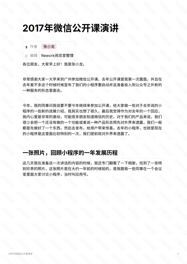 2017年微信公开课演讲作者张小龙三编辑Reworki阅览室整理各位朋友,大家早上好!我是张小龙。非常感谢大家一大早来到广州参加微信公开课。去年公开课是我第一次露面,并且在去年差不多这个时候时候宣布了我们的小程序要启动并且准备投入到公众号之外新的一种服务的形态里面去。今年,我的同事问我说要不要今年继续来参加公开课,给大家做一些对于去年说的小程序的一些新的进展介绍,我其实也想了很久,最后我觉得作为对去年的一个回应,我内心里是非常的激动,可能很多朋友知道微信的历史,对于我们的产品来说,我们很少会把一个还没有做的一个功能或者说一种产品形态预先对外界来透露,我们一般都是先做好了一个东西,然后去发布,给用户带来惊喜。去年的小程序,也就是现在的小程序是这里面比较特别的一次,我们提前就对外界来透露了。一张照片,回顾小程序的一年发展历程这几天我在准备这一次讲话的内容的时候,我还专门翻看了一下相册,找到了一张特别珍贵的照片,这张照片是在大约一年前的时候拍的,是我跟我一些同事在一个会议室里面大家讨论小程序,当时叫应用号。2017年微信公开课演讲照片上写了几个字,“应用号,2016年1月9日",底下还有几个字,"“启动日",今天离当时的启动日只有几天的时间,这个照片上的人可能大家会觉得比较陌生,但对我来说很熟悉,并且特别亲切。我特别感谢照片上的这些人,以及他们背后的团队,这一天我们定下启动日到现在,头一次把我们要做的事情先对外做了一个报告,然后在一年以后来报告我们一年努力的结果。当时我们在讨论订阅号和服务号的关系,其实我们很早就在想微信应该有一种新的形态,不应该只是停留在订阅号或者公众号,不应该只是提供一种订阅能力,一种推送能力,而是应该提供更多新的能力,这种新的能力更加像一种应用程序的能力。当天晚上我记得有一个开发的小伙子拿了他开发了一些接口DEMO,说我们在开发上有这样一些基础的接口可以做,其实那是一个很好的灵感,既然我们能在这样的接口上做出来,那么我们也能做出一些复杂的接口,通过更加复杂的接口实现应用程序所需要的基本元素,沿这个思路一想,我们就不再纠结于怎么样扩充公众号,去把它变成个有更强大功能的公众号,而是完全可以跳开公开号,去做一种新的应用形态,这就是待会要跟大家介绍的小程序。2017年微信公开课演讲从小程序看微信的产品理念再次解释用完即走在小程序之前我很愿意用这个时间解释一下去年的这个时候,当时也是在公开课,当时我提出了一个理念,这个理念后来我也发现很多的人说,看了以后觉得不太能够理解,所以我在这花几分钟重新来解释一下这个理念。我当时说,一个好的软件,一个好的工具应该让用户用完即走的,后来发现很多朋友,包括一些业内人士都会来笑话我们,说因为微信有足够多的用户,有足够强大的用户黏性,所以你们可以这样说,但是对于其他的产品来说,大家会觉得怎么样黏住用户,怎么样让用户不要离开才是他们追求的目标。我想,这里可能对于用完即走有一个很大的不理解,或者说误解。在我看来,这里有一个很简单的逻辑,这个逻辑可以推理出这样一个结果,我认为,任何一个工具都是帮助用户提高它的效率的,用最高效率的方法去完成它的任务,这是工具的目的,工具的使命。微信也是一个工具,所以微信的目的也是帮助用户用最高效的方法去完成它的任务。什么是最高效的方法?就是用最短的时间去完成任务,也就是说一旦用户完成了它的任务,它就应该去做别的事情,而不是停留在产品里面,这就是用完即走的含义。微信是工具还是平台?在我们对公司的一次培训里面,有个同事问我微信的战略是什么?我当时只说了一句话,我说微信只是一个工具,我们应当想如何做好这个工具。在同事们的心目中,微信并不仅仅是一个工具,大家认为微信是一个平台。但我认为微信是一个工具,这是一个非常宏大的目标,我并不认为一个工具是一个很低层面的东西,事实上人类从原始人进化智能人类的过程,就是因为人会制造工具,我们所用的绝大部分的产品本质上来说都是工具,但是工具有好坏之分,能够做一个非常好的工具其实难度是非常大的,但是如果说我们要做一个平台,我会不知道我们要做什么?2017年微信公开课演讲一个好的工具应该有一个很强的属性,就是提高效率,用完即走。做产品是克制还是自我压制?这个理念其实贯穿在我们的产品的每一个点里,举一个例子。我们前不久开了一次内部会议,腾讯创始人之一Toy说,其实微信团队保持了一种很克制的心态来做事情。很多人也认为我们在微信产品里很克制,但其实我当时听到这样的评论是有一点点惊讶,因为克制这个词从来没有在我的脑袋里面出现过,如果说做一些事情我们要求自己很克制的话,那是一种什么样行为?那是一种自我压制的行为,但是我并不认为我们在做这样的决定时我们要自我压制,或者说自己切割掉我们很多想要做的事情,那不是一个很好的状态。合理性才是最重要的因素相反的,我们在做很多很多决定的时候,反而要去判断什么样的东西是最合理的,合理性才是这里面要考虑的一个最重要的因素,我们会舍弃掉很多很多本来想要做,后来发现做不好的东西,这种舍弃并不是因为说我们很克制,所以我们少做一点,而是