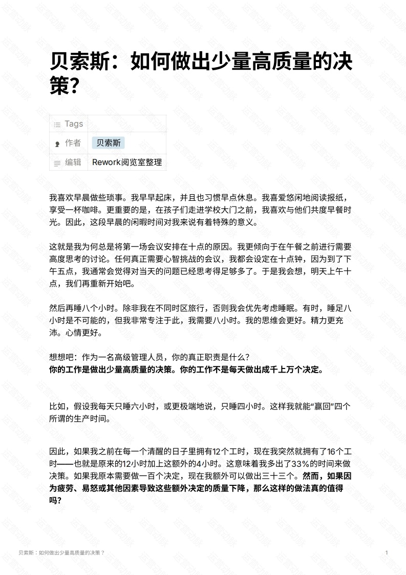 贝索斯:如何做出少量高质量的决策?Tags贝索斯三编辑Rework阅览室整理我喜欢早晨做些琐事。我早早起床,并且也习惯早点休息。我喜爱悠闲地阅读报纸,享受一杯咖啡。更重要的是,在孩子们走进学校大门之前,我喜欢与他们共度早餐时光。因此,这段早晨的闲暇时间对我来说有着特殊的意义。这就是我为何总是将第一场会议安排在十点的原因。我更倾向于在午餐之前进行需要高度思考的讨论。任何真正需要心智挑战的会议,我都会设定在十点钟,因为到了下午五点,我通常会觉得对当天的问题已经思考得足够多了。于是我会想,明天上午十点,我们再重新开始吧。然后再睡八个小时。除非我在不同时区旅行,否则我会优先考虑睡眠。有时,睡足八小时是不可能的,但我非常专注于此,我需要八小时。我的思维会更好。精力更充沛。心情更好。想想吧:作为一名高级管理人员,你的真正职责是什么?你的工作是做出少量高质量的决策。你的工作不是每天做出成千上万个决定。比如,假设我每天只睡六小时,或更极端地说,只睡四小时。这样我就能"“赢回”四个所谓的生产时间。因此,如果我之前在每一个清醒的日子里拥有12个工时,现在我突然就拥有了16个工时一也就是原来的12小时加上这额外的4小时。这意味着我多出了33%的时间来做决策。如果我原本需要做一百个决定,现在我额外可以做出三十三个。然而,如果因为疲劳、易怒或其他因素导致这些额外决定的质量下降,那么这样的做法真的值得吗?贝案斯:如问做出少量高质量的决策?现在,如果我们说的是一家初创公司,那情况肯定不同。当亚马逊仅有一百名员工的时候,状况确实不同。但事实上,亚马逊已经不再是一家初创公司,而且所有的高级管理人员与我有相似的工作方式。他们的目光都投向未来,他们活在未来。那些向我汇报工作的人,不应该仅仅局限自己于当下这个季度的表现。当我参与华尔街的季度电话会议,表现出色时,人们常常会走上前来对我说:“恭喜你这个季度做得好。"我通常会回应:“谢谢。"但实际上,在我心里我知道,这个成功的季度其实是三年前就已经铺垫好的。目前,我正在为2023年的某个季度做准备,这就是我们都应该做的。你需要提前两到三年来进行深思熟虑。如果你已经这样做了,那么我今天为何还需要做一百个决定呢?如果我每天能做出三个高质量的决定,那就已经足够了。沃伦巴菲特曾说,如果他一年能做出三个优秀的决定,那么他就认为自己是成功的。我深信这个观点。如何做决策有一些手段能够提高决策的速度,这非常关键。如果让我大胆地给其他高管提一些建议,我会强调一点一这也是我在亚马逊观察到的一那就是,初级管理人员往往会模仿高级管理人员的决策方式,这是很自然的。但问题在于,你总是仰望高层并视他们为榜样,很多时候甚至是下意识地这样做。模仿的风险在于,它可能忽视了决策的多样性这一事实。有两种类型的决策。有些决定是不可逆转的,后果严重;我们称之为单向决定,或第二类决定。这些决策需要缓慢而谨慎地做出。我经常发现自己在亚马逊担任首席减速官:"哇,我想再从十七个方面分析一下这个决策,因为它后果严重,不可逆转。”问题是,大多数决策都不是这样的。大多数决策都是双向的。你可以做出决定,然后一步步走下去。如果发现是错误的决定,你可以后退。而在大型组织一不是初创公司,会发生的情况是,所有的决策最终都要使用很重的决策流程,而这种流程实际上只适用于不可逆转、后果严重的决策。这是一场灾难。贝案斯:如问做出少量高质量的决策?当需要做出决策时,你需要问:"这是单向还是双向的?"如果是双向的,那就与一个小团队,甚至是一个判断力强的人一起讨论,然后做出决定。如果是错的,那就是错的,但你会纠正它。但如果是单向的,则要从五个不同的角度进行分析。要小心,因为慢就是平滑,平滑就是快。你不希望很快做出单向决定。你希望达成共识,或至少推动大量的思考和辩论。除了问自己一项决策是单向还是双向之外,真正能加快决策速度的是倡导“不同意就承诺"的原则。因此,你需要有充满激情的传教士。有的决策关乎到很多人,一不小心,决策过程就会变成一场消耗战。谁最有耐力,谁就能获胜;最终,持相反意见的另一方就会屈服:"好吧,我累了。按你的方式来吧"。这是世界上最糟糕的决策过程。它会让每个人都士气低落,而且还会得到一种随机的结果。更好的办法是,由管理者上报给更高层的领导。有争议的决策需要迅速上报。你不能让两个下级争论一年,耗尽自己的精力。你必须教会这些下级。当你的团队彻底陷入矛盾和僵局时,应立即将问题上升至更高层级一速度越快越好。作为团队中资历更为丰富的成员,你的任务是细致聆听各方观点。然后,你可以这样表达:“大家注意了,面对当前的问题,我们都没有确凿的解决方案。但我希望你们能与我一起勇敢尝试。即使你们不同意,也请做出承诺和支持。我们将采取这一路径行动。而我特别希望,即使你们有异议,也能积极地承诺并参与到这个决策中。”这里有个重要的一点:有时这种不同意见是在资历更高的人和下属之间发生的。下属非常想以一种方式去做,而资历更高的人则认为应该用另一种方式去做。在这种情况下,资历更高的人往往应该选择“不同意但承诺