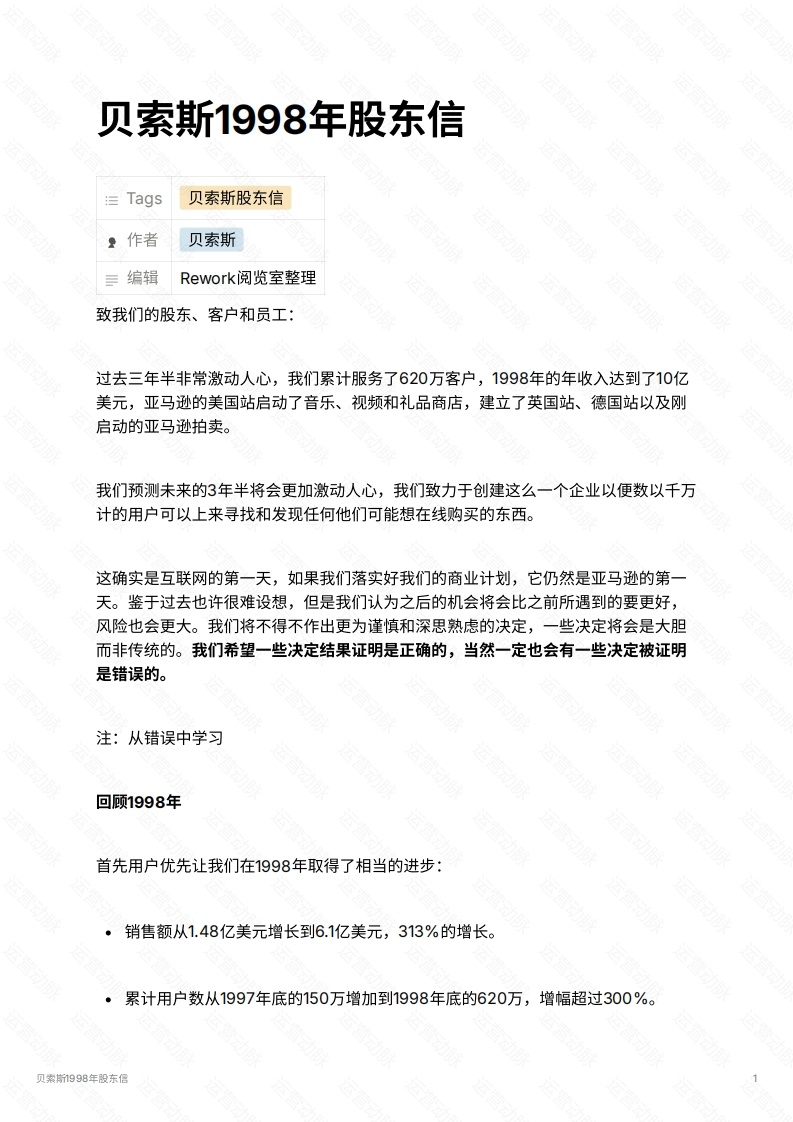 贝索斯1998年股东信Tags贝索斯股东信贝索斯三编辑Rework阅览室整理致我们的股东、客户和员工:过去三年半非常激动人心,我们累计服务了620万客户,1998年的年收入达到了10亿美元,亚马逊的美国站启动了音乐、视频和礼品商店,建立了英国站、德国站以及刚启动的亚马逊拍卖。我们预测未来的3年半将会更加激动人心,我们致力于创建这么一个企业以便数以千万计的用户可以上来寻找和发现任何他们可能想在线购买的东西。这确实是互联网的第一天,如果我们落实好我们的商业计划,它仍然是亚马逊的第一天。鉴于过去也许很难设想,但是我们认为之后的机会将会比之前所遇到的要更好,风险也会更大。我们将不得不作出更为谨慎和深思熟虑的决定,一些决定将会是大胆而非传统的。我们希望一些决定结果证明是正确的,当然一定也会有一些决定被证明是错误的。注:从错误中学习回顾1998年首先用户优先让我们在1998年取得了相当的进步:·销售额从1.48亿美元增长到6.1亿美元,313%的增长。·累计用户数从1997年底的150万增加到1998年底的620万,增幅超过300%。贝案斯1998年股东信尽管新用户增长强劲,但是在亚马逊网站上,回头客所产生的订单占比依然从97年四季度的超58%增长到98年同期的超64%。亚马逊音乐商店是我们第一个重要的产品扩展,并且在它第一个完整的季度成为领先的在线音乐零售商。·继10月推出亚马逊品牌和亚马逊公司技术之后,亚马逊英国和亚马逊德国在四季度的销售额比三季度几乎翻了两番,正在建立两者在各自国家在线书店的领先地位。·继音乐之后,1月我们又增加了视频和礼品。并且仅用了6周时间,我们就成为领先的在线视频零售商。注:我们要注意亚马逊如今已经推出了自己投资制作的视频。·98年四季度销售额中的25%来自于亚马逊英国和亚马逊德国,以及亚马逊.co上的音乐、视频和礼品销售等新业务。·通过一键式购物、礼品点击、店内销售排名和即时推荐等创新,我们显著改善了我们的用户体验。·1998年的收入和用户增长以及1999年持续增长的实现,依赖于我们基础设施的扩展。其中的重点如下:·1998年,我们的员工从大约600人增长到超2100人,而且我们的管理团队得到了很大的加强。·我们在英国和德国开设了配送和客户服务中心。1999年初,我们宣布在内华达州费恩利租了约为32.3万平方英尺的高度机械化配送中心。这个最新的设施将使我们的配送容量增加一倍以上,并使我们能够进一步缩短送货时间贝案斯1998年股东信·我们的商品清单从年初的900万增加到年未的3000万,这让我们的客户能够更容易搜到他们想要的产品,也让我们通过从厂家直接采购,降低产品的成本。我们的现金和投资余额,在1998年5月的高收益债券发行和1999年初的可转换债券发行之后,现在已经超过15亿美元,为我们提供了雄厚的财务实力和战略灵活性。我们很幸运能从一种现金优先、资本效率高的商业模式中获益。由于我们不需要建立实体店或库存商店,我们的集中配送模式使我们的业务达到十亿美元规模的同时,只有3000万美元的库存和3000万美元的净厂房和设备。1998年,我们的营运现金流为3100万美元,超过了2800万美元的固定资产净增加额。我们的客户我们打算建立世界上最以客户为中心的公司。我们认为顾客是敏锐的、聪明的,并且品牌形象跟随现实而不是相反。我们的客户告诉我们,他们选择亚马逊并选择把亚马逊分享给他们的朋友是因为我们提供的选择、易用性、低价格和服务。但是疲倦的人不能休息。我经常提醒我们的员工要心存敬畏,每天早上醒来都要心存敏畏。不是因为竞争,而是因为客户。我们的客户塑造了我们的事业成为今天的样子,他们与我们建立了深厚的联系,我们对他们有巨大的责任。我们认为他们对我们保持忠诚,直到有人给他们提供更好的服务。注:不是客户忠诚于企业,而是企业忠诚于用户。我们必须致力于持续地改善、试验和创新。我们热衷成为先锋,这是亚马逊的DNA,这也是件好事,因为我们将需要这种先锋精神帮助我们成功。我们对通过不断创新和不懈关注客户体验所建立的差异而感到自豪,我们相信我们在1998的举措反映了我们的精神:我们的音乐、视频、英国和德国的商店,就像我们的美国书店,是最好的种子。注:差异化不是目的,而是努力的结果。努力工作,享受乐趣,创造历史贝案斯1998年股东信