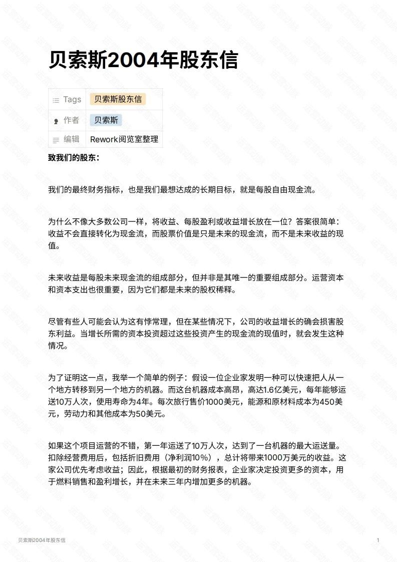 贝索斯2004年股东信Tags贝索斯股东信作者贝索斯三编辑Rework阅览室整理致我们的股东:我们的最终财务指标,也是我们最想达成的长期目标,就是每股自由现金流。为什么不像大多数公司一样,将收益、每股盈利或收益增长放在一位?答案很简单:收益不会直接转化为现金流,而股票价值是只是未来的现金流,而不是未来收益的现值。未来收益是每股未来现金流的组成部分,但并非是其唯一的重要组成部分。运营资本和资本支出也很重要,因为它们都是未来的股权稀释。尽管有些人可能会认为这有悖常理,但在某些情况下,公司的收益增长的确会损害股东利益。当增长所需的资本投资超过这些投资产生的现金流的现值时,就会发生这种情况。为了证明这一点,我举一个简单的例子:假设一位企业家发明一种可以快速把人从一个地方转移到另一个地方的机器。而这台机器成本高昂,高达1.6亿美元,每年能够运送10万人次,使用寿命为4年。每次旅行售价1000美元,能源和原材料成本为450美元,劳动力和其他成本为50美元。如果这个项目运营的不错,第一年运送了10万人次,达到了一台机器的最大运送量。扣除经营费用后,包括折旧费用(净利润10%),总计将带来1000万美元的收益。这家公司优先考虑收益;因此,根据最初的财务报表,企业家决定投资更多的资本,用于燃料销售和盈利增长,并在未来三年内增加更多的机器。贝案斯2004年股东信以下是这个项目头四年的收入报表:EarningsYear 1Year 2Year 3Year 4(in thousands)Sales$100.000S200.000$400.000$800.000Units sold100200400800GrowthN/A100%100%1009%Gross profit55.000110.000220.000440.000Gross margin55%55%559%55%Depreciation40.00080.000160.000320.000Labor other costs5.00010.00020.00040.000Earnings$10.000$20.000$40.000$80.000Margin10%10%10%GrowthN/A100%100%100%这张报表让人印象深刻:100%的复合收益增长率,1.5亿美元的累计收益。相信看到上述利润表的投资者会感到十分高兴。然而,现金流却是完全不同的情况。同样在这四年里,运输业务产生了5.3亿美元的负自由现金流。Cash FlowsYear 1Year 2Year 3Year 4(in thousands)Earnings$10.000s20.000$40.000$80.000Depreciation40.00080.000160.000320.000Working capitalOperating Cash Flow50.000100.000200.000400.000Capital expenditures160.000160.000320.000640.000Free Cash Flow$(120.000)$(240.000)当然,在其他商业模式的收益更接近现金流。但是,我们的运输模型表明,不能依赖利润报表来判断股东利益是否遭受损耗。还有一点需要注意,EBITDA(未计利息、税款、折旧及摊销前盈利)会导致我们对业务情况得出同样错误的结论。假设每年的未计利息、税款、折旧及摊销前盈利分别为5000万美元、1亿美元、2亿美元和4亿美元,连续三年实现100%的增长。但是,如果未将12.8亿美元的资本支出算在其中,那我们看到的数据只是冰山一角,并不全面,因为我们忽视了生成现金流的必要因素一资本支出。如果我们相应地调整增长率和机器的资本开支,现金流会更加恶化还是有所改善?Number ofYear I to4Machines inCumulativeCumulative FreeYear 2,3 and 4 Sales and Earnings Growth RateYear4Earnings(in thousands)S40.000$40.000100%,50%,33%4S100.000$(140.000)1009%,100%,100%8S150.000$(530.000)奇怪的是,从现金流的角度来看,这项业务增长地越慢,现金流情况就越好。一旦为第一台机器投入初期资本支出,理想的增长轨迹就是迅速增加00%的运营能力,然后停止增长。然而,即使只有一台机器,累计现金流总额直到第四奶奶才超过初期的机器成本,这股现金流的净现值(为资本成本的12%)依然为负。不幸的是,我们的运输业务存在根本性的缺陷。增长率对运作业务的初期投资或后续资本来说没有任何意义。实际上,我所举出的例子很清晰的说明了这一点。决定投资前,投资者会从经济学角度分析净现值,并快速确定这个项目值不值得投资。尽管在现实世界的情况更加微妙和复杂,但是收益与现金流之间的两面性问题一直存在。现金流量表常常没有得到应有的关注和重视。眼光敏锐的投资者不会只限于关注利润报表。Amazon.com的财务重点是每股自由现金流的长期增长。亚马逊的自由现金流主要来自于不断增加的营业利润、有效管理的营运资金以及资本支出。我们致力于通过改善客户体验的各个方面来增加销量,并通过保持精简的成本贝案斯2004年股东信结构来提升销售额。我们拥有现金产生的运营周期(运营周期=存货周转天数+营收账款周转天数-应付账款周转天数),因为我们能够快速消化库存,在从客户那里收取款项后,才向供应商支付相应的货款。我们的高库存周转率,意味着我们能够维持相对较低的库存投资水平,在年底时为4.8亿美元,同期销售额接近70亿美元。我们商业模式的资本效率可以通过对固定资产的湿度投资来说明,年末这笔投资达到2.46亿美元,相当于2004年销售额的4%。2004年自由现金流增长了38%,达到4.77亿美元,比上年增长了1.31亿美元。我们相信,如果我们继续提升客户体验(包括增加商品选择和降低价格)和执行效率,我们的价值主张和自由现金流将得到进一步好转。股权稀释方面,2004年亚马逊的总流通股和鬼獒奖励与2003年持平,与过去三年相比,下降了1%。同时,我们还通过偿还6亿美元的可转换债务,减少了600多万股的潜在稀释股票,这部分债务将在2009年和2010年到期。有效管理股票总量,意味着更多的每股现金流,给持股人带来更高的长期价值。关注自由现金流,对于亚马逊公司来说并不是什么新鲜事