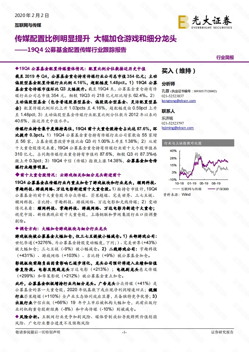 4公募基金配置传媒行业跟踪报告:传媒配置比例明显提升 大幅加仓游戏和细分龙头