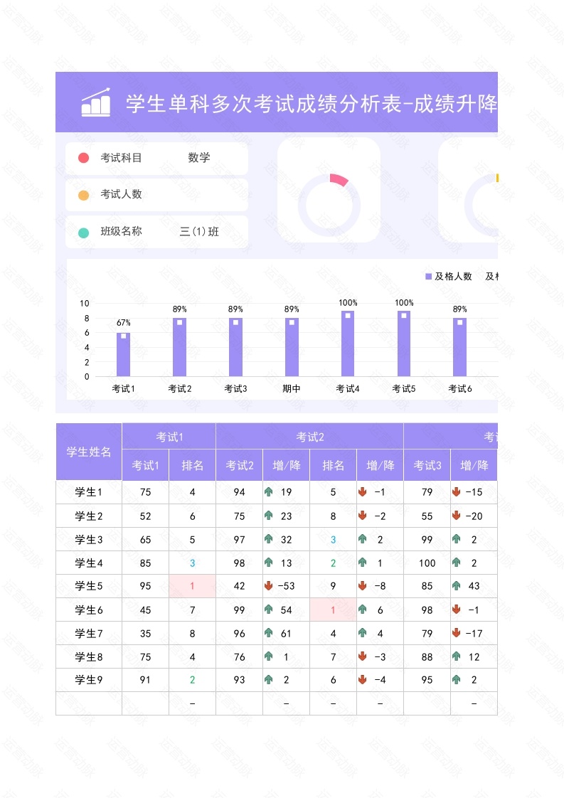 学生单科多次考试成绩分析表-成绩升降考试科目数学考试人数班级名称三(1)班■及格人数及10100%100%89%89%89%89%8■■67%620考试1考试2考试3期中考试4考试5考试6考试1考试2考学生姓名考试1排名考试2增/降排名增/降考试3增/降学生17594个195-179-15学生252b75个238-255学生36597个323个299个2学生485398个1321100个2学生59542-53-885个43学生645799个541698-1学生735896614479学生87547617-388个12学生991293个2-495云动一云分析格率平均分数据分析100100%■0考试1考试2考试3期中考试4考试5期末式3考试4考试5排名增/降期中增/降排名增/降考试4增/降排名7-2100169548个7571100个252925-395个341757-677个26992495-443-298309637-388961979252538-3100个471495089-65一一云动云动10644%44%44%4211%0考试6期末考试1考试2考试3期中考试6考试7增/降考试5增/降排名增/降考试6增/降排名增/降-39713854-3668↓-32-754-14531786-2991185385个04-1-295085-2844-1851475785个1047835-49232197893-4一一■优秀人数■优秀率89%78%33%11%考试4考试5考试6期末考试8备注期末增/降排名增/降考试科目平均分965-1考试168.6797个43个1考试285.5698-13-2考试386.449922期中86.111001考试493.7896个115-1考试584.6797个124个0考试684.78956-3期末9686-7-5运营动脉运营动脉运营动脉运动脉运营动脉运营动脉运营动脉运营动脉运营动脉运营动脉运营动脉运营动脉运营动脉运营动脉运营动脉运营动运营动脉运营动脉运营动脉运营动脉运营动脉运营动脉运营动运营动脉运营动脉运营动脉运营动脉运营动脉运营动运营动脉运营动脉运营动运营动脉运营动脉运营动脉运营动脉运营动脉运营动脉运营动脉运营动脉运营动脉运营动脉运营动脉运营动脉运营动脉运营动脉运营动脉运营动脉运营动脉运营动脉运营动运营动脉运营动脉运营动脉运营动脉运营动脉运营动脉运营动运营动脉运营动脉运营动脉运营动脉运营动脉运营动脉运营动脉运营动脉运营动运营动运营动考试总人数9人及格分数60分优秀分数95分考试1考试2考试3期中考试4及格人数68889优秀人数147及格率67%89%89%89%100%优秀率11%44%44%44%78%89%56%56%56%22%