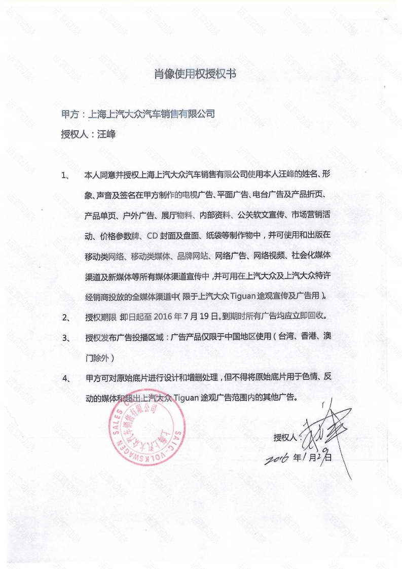 首页职场资料合同范本合同实例汪峰肖像使用授权书